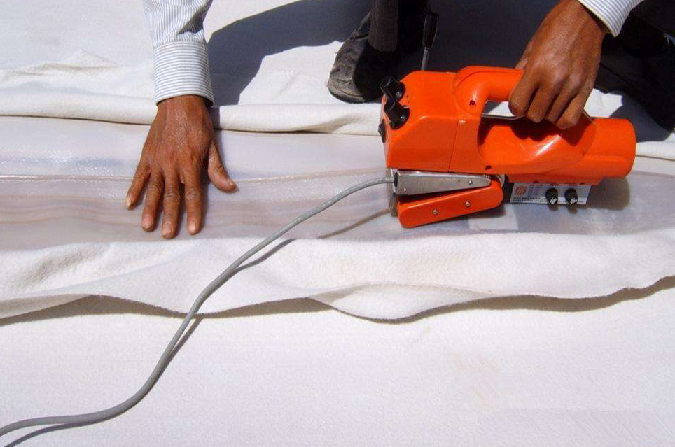 土工膜的試驗(yàn)性焊接要求,焊接工作開(kāi)展之前必須進(jìn)行試焊,試焊應(yīng)在裁剪的土工膜樣品上進(jìn)行,樣品長(zhǎng)度不小于1米,寬不小于0.2 米,每天早、中開(kāi)工分別要做一次試焊。試樣用拉力機(jī),進(jìn)行現(xiàn)場(chǎng)剝離及剪切試驗(yàn),焊縫不被撕拉破壞,母材被撕裂開(kāi)為合格,確保焊接機(jī)性能,焊接方法,焊接溫度等外界條件無(wú)誤后,征得監(jiān)理工程師或業(yè)主代表同意后,用已調(diào)節(jié)好工作狀態(tài)的熱楔焊機(jī)逐幅進(jìn)行正式焊接。