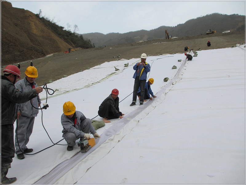 復合土工膜順坡鋪設,搭接方向要上坡壓下坡,上游壓下游,以防水流沖刷造成損壞,鋪膜時要留有褶皺,但應與壩面貼緊,不留空隙。壩坡在錨固槽部位設10cm寬折疊伸縮帶。松緊度不少于 5%,以適應不同情況的變形,鋪膜時要趕掉膜下氣泡,鋪膜時嚴禁工作人員穿帶釘?shù)男M行作業(yè)。復合土工膜在結合部位要通過結合槽連接,確保結合部位的連接起到防滲作用。