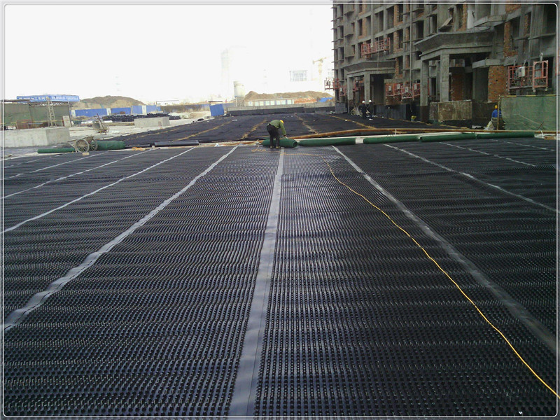 排水層的傳統(tǒng)構(gòu)造是采用厚度不小于100mm的卵石、碎石或陶粒,其中陶粒的通水性能略遜于前二者,傳統(tǒng)做法對(duì)屋面結(jié)構(gòu)會(huì)產(chǎn)生較大的承載壓力。隨著部分外資工程的建設(shè),(蓄)排水板從歐美引入我國(guó),憑借其重量輕、施工便捷、造價(jià)低的優(yōu)勢(shì)逐漸成為(蓄)排水層的主流用料。(蓄)排水板又分為網(wǎng)格交織型和凹凸型兩種,其中由于常規(guī)的凹凸型(蓄)排水板售價(jià)略低并兼具一定的蓄水性能,目前應(yīng)用相對(duì)較多。